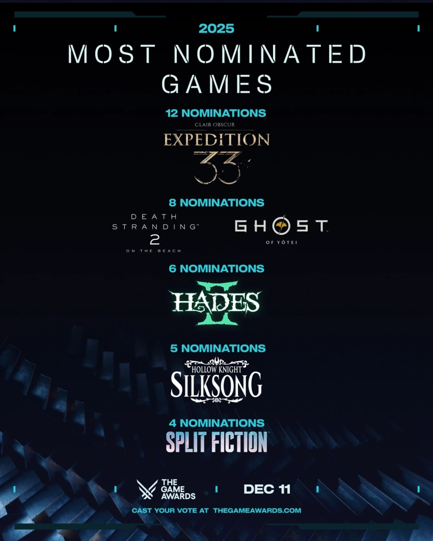 На большее число наград The Game Awards 2025 претендует Clair Obscur: Expedition 33 — игра может забрать сразу 12 статуэток. По 8 номинаций у Death Stranding 2: On the Beach и Ghost of Yotei. Кроме того, выделяются:
