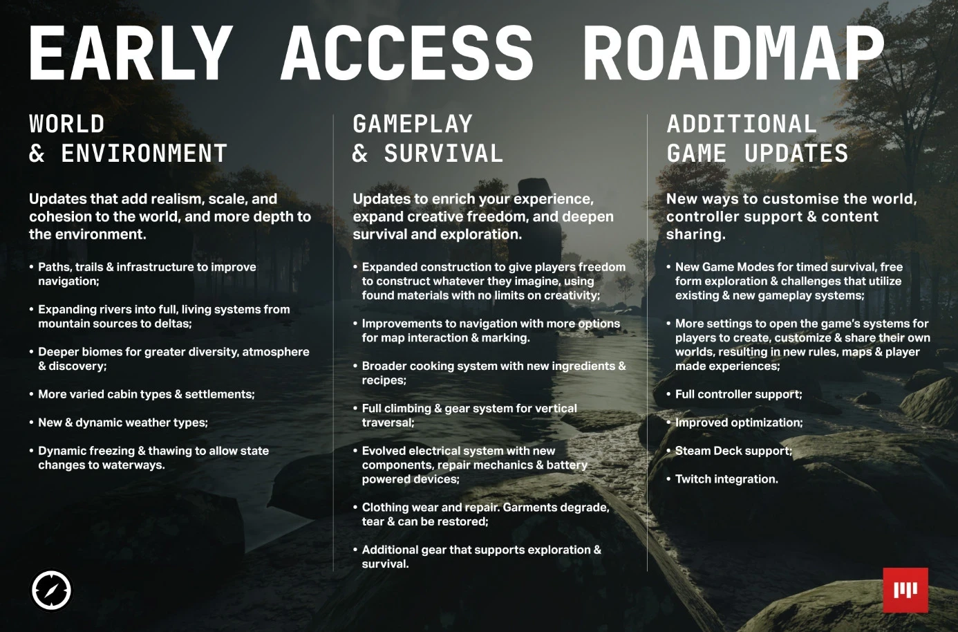 В игровом процессе акцент будет сделан на расширение механик строительства и крафта. Заодно игроки смогут обзавестись альпинистским снаряжением и исследовать вертикальные пространства. Одежда и инструменты помогут эффективнее выживать. А вот аккумуляторы, топливо и прочие подобные объекты будут образовывать системы энергопотребления.