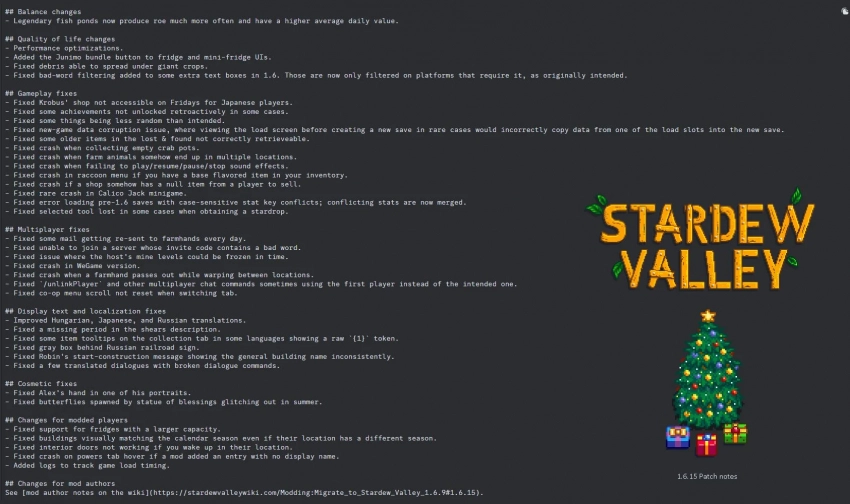 Самое интересное о кино на YouTube канале Игромании!Скриншот Stardew ValleyХотя Эрик Барон давно уже объявил, что переключается на Haunted Chocolatier, реальность оказалась совершенно иной: работа над новым проектом приостановлена, а культовый симулятор фермы Stardew Valley продолжает получать обновления. На PC, Android и iOS как раз вышло очередное: патч 1.6.15.