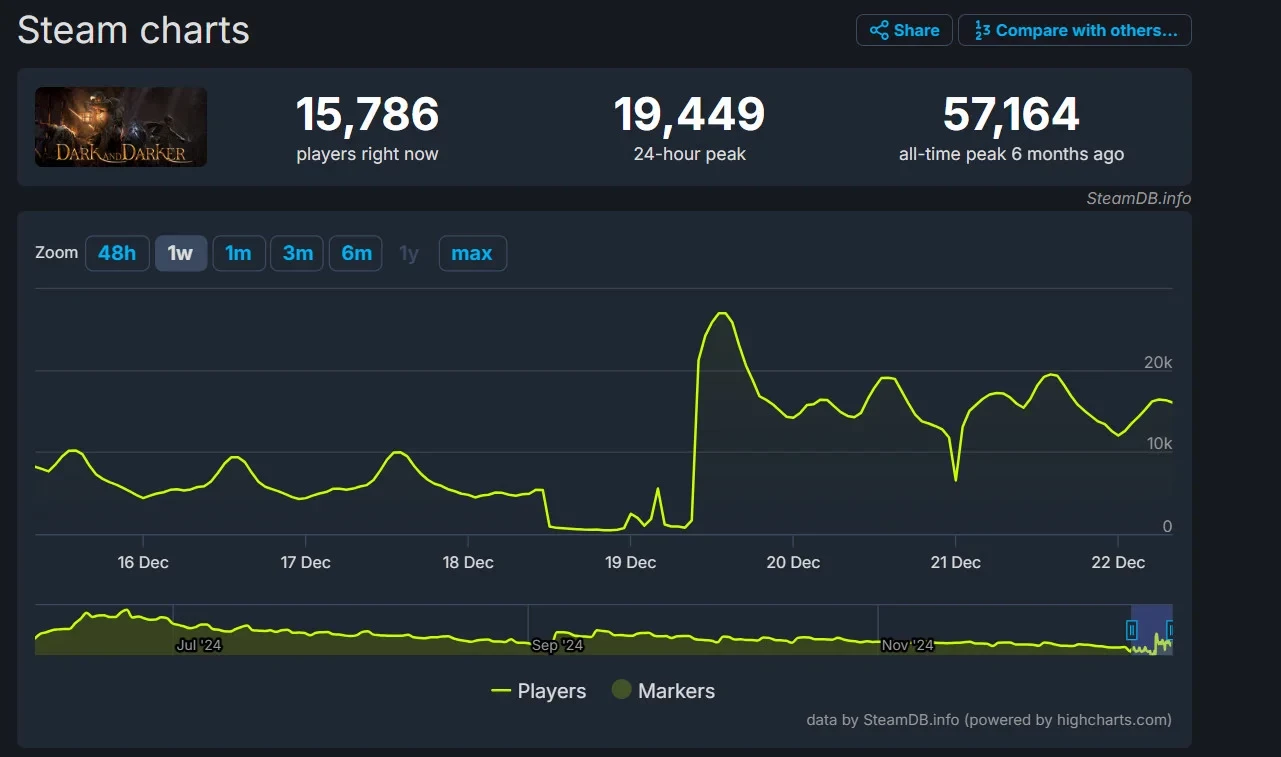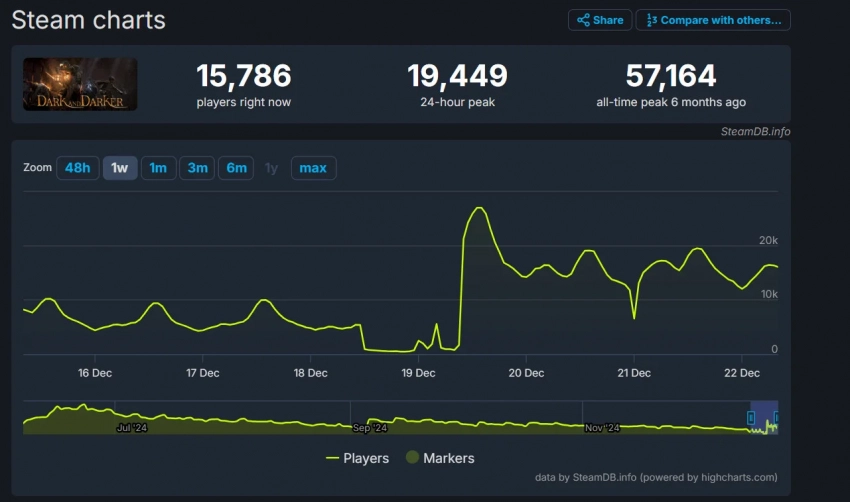 В период появлениях всех этих новинок пиковый онлайн Dark and Darker в Steam составил почти 27 тысяч человек (19 декабря), а за последние 24 часа в шутере находилось более 19 тысяч игроков одновременно. Ранее аналогичные показатели наблюдались в сентябре, когда стартовал четвёртый сезон.
