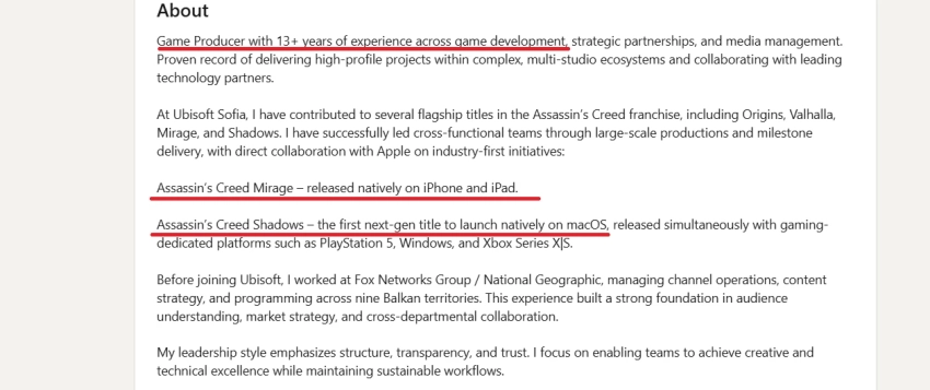 У себя на страничке она указала, что Assassinʼs Creed Mirage стала «первой AAAA-игрой, получившей нативный релиз на iPhone и iPad». А Assassinʼs Creed Shadows — это «первая AAAA-игра нового поколения, получившая нативный релиз на macOS […]».