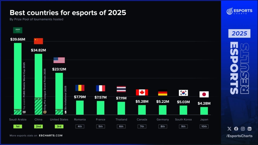 Саудовская Аравия обошла Китай и США по сумме призовых в киберспорте за 2025 год