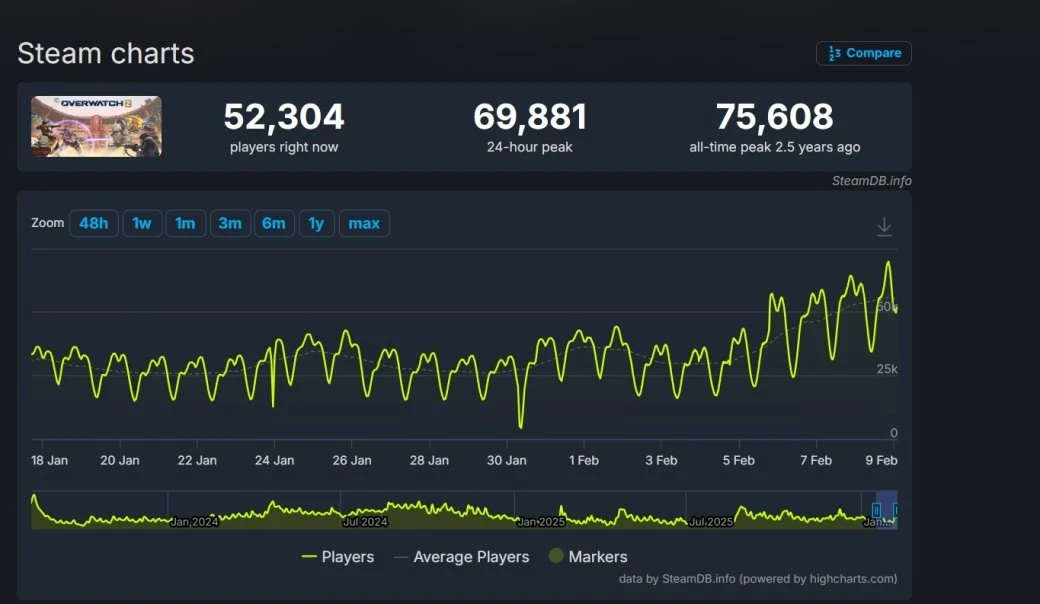 Обложка: скриншот игры OverwatchOverwatch (2023), которая теперь без «2» в названии, переживает всплески интереса в Steam. Её суточный пиковый онлайн достиг 69 881 игроков одновременно, и это новый максимум с релиза.