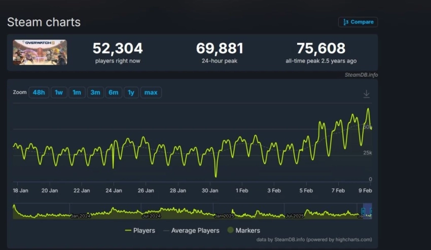 Напомним, что Overwatch (когда она ещё была Overwatch 2) вышла в Steam в августе 223 года. В тот месяц она привлекла 75 608 игроков одновременно, что стало её рекордом.
