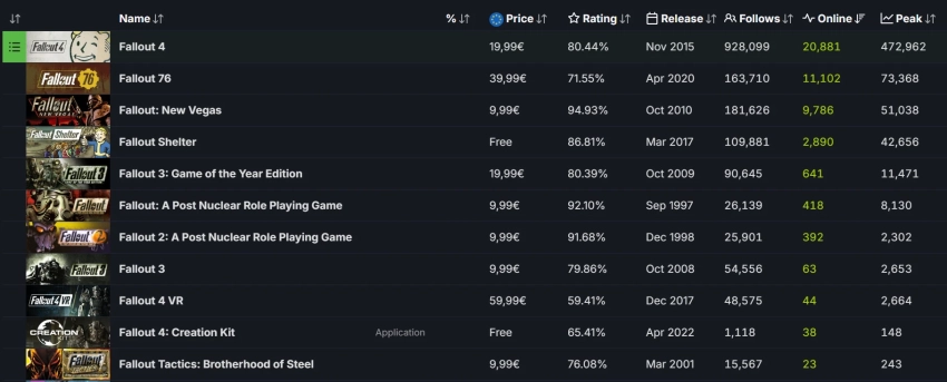 У многопользовательской Fallout 76 онлайн также находится на рекордных показателях за последнее время. 1 февраля в игре находилось свыше 33 тысяч геймеров одновременно. В апреле 2024 года игра привлекла более 73 тысяч человек на пике онлайна в Steam.