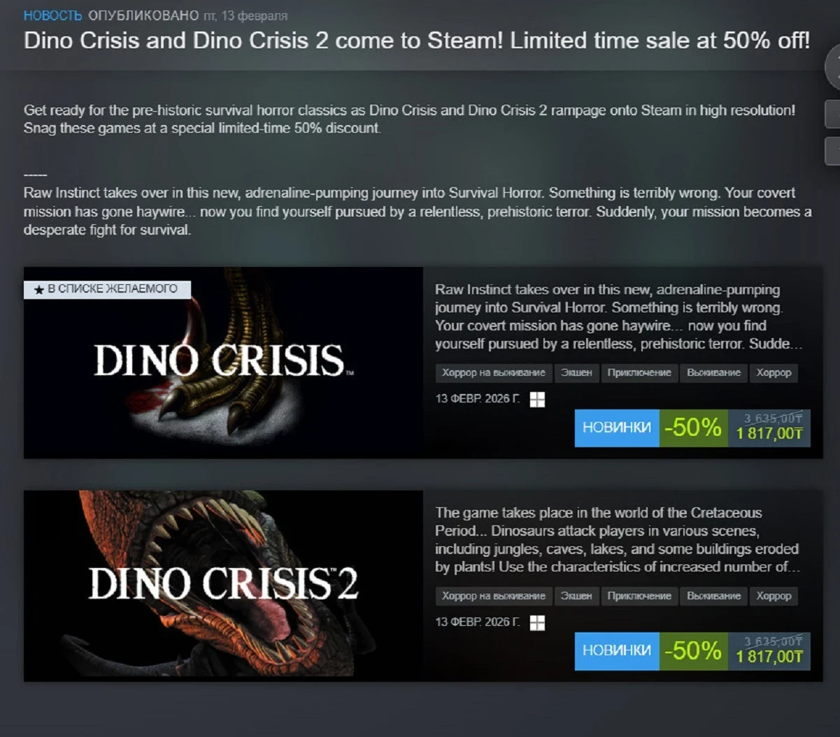 Обложка: постер Dino CrisisПервые две части Dino Crisis неожиданно вышли в Steam после того, как в начале 2025 года они посетили GOG. Увы, обе игры недоступны в российском регионе. А до 26 февраля на них действует скидка в 50% в рамках распродажи Capcom. Версии идентичны тем, что продаются в GOG.
