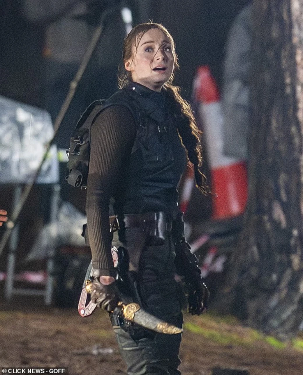 Героиня в исполнении Софи Тёрнер («Игра престолов») держит в руках нож, и в оригинальной новости сообщается о съёмках «боевых сцен». На кадры попал побег Лары — на свои двоих и на мотоцикле, которым управляет персонаж по имени Зип.