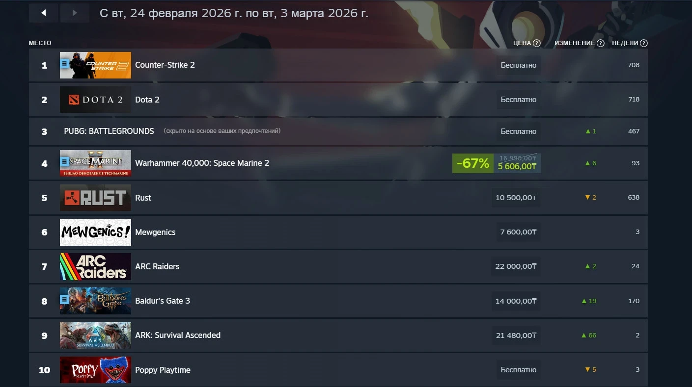 Топ-10 самых прибыльных продуктов в Steam за период с 24 февраля по 3 марта 2026 года