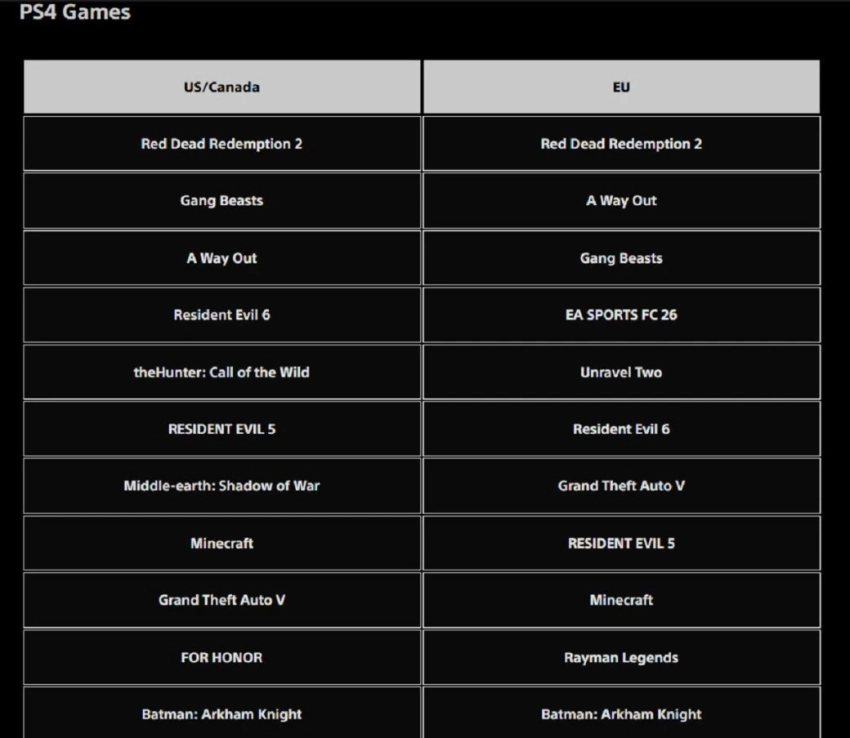 Для PlayStation 4 уже не выходит громких хитов, поэтому топ-20 по загрузкам состоит из современной классики. Например, лидером в США с Канадой и Европе стал вестерн Red Dead Redemption 2. Также в обоих сегментах игроки активно загружали пятую и шестую части Resident Evil.