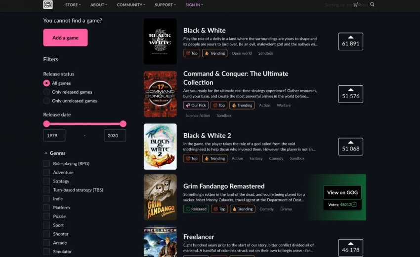 Новый список GOG позволит голосовать за появление желанной «классики» самим игрокам
