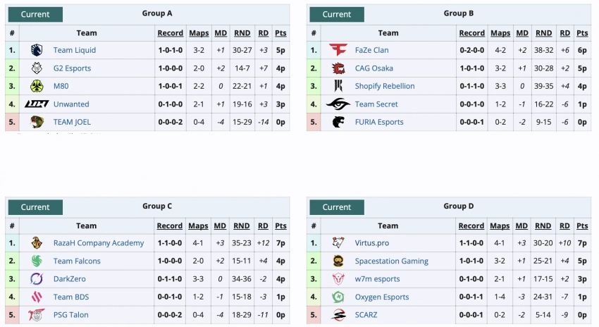 Virtus.pro по-прежнему сохраняет лидерство в своей группе. Что касается других пятерок, то группу А возглавляет Team Liquid, в группе В на первом месте FaZe Clan, а в группе С лидирует RazaH Company Academy.