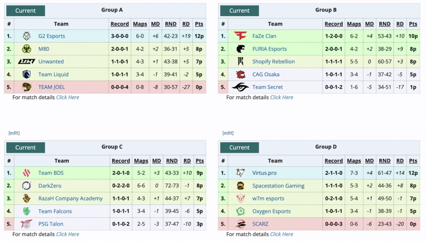Virtus.pro уверенно держится в своей группе на первом месте. Что касается других пятерок, то группу А возглавляет G2 Esports, в группе В на первом месте FaZe Clan, а в группе С лидирует Team BDS.