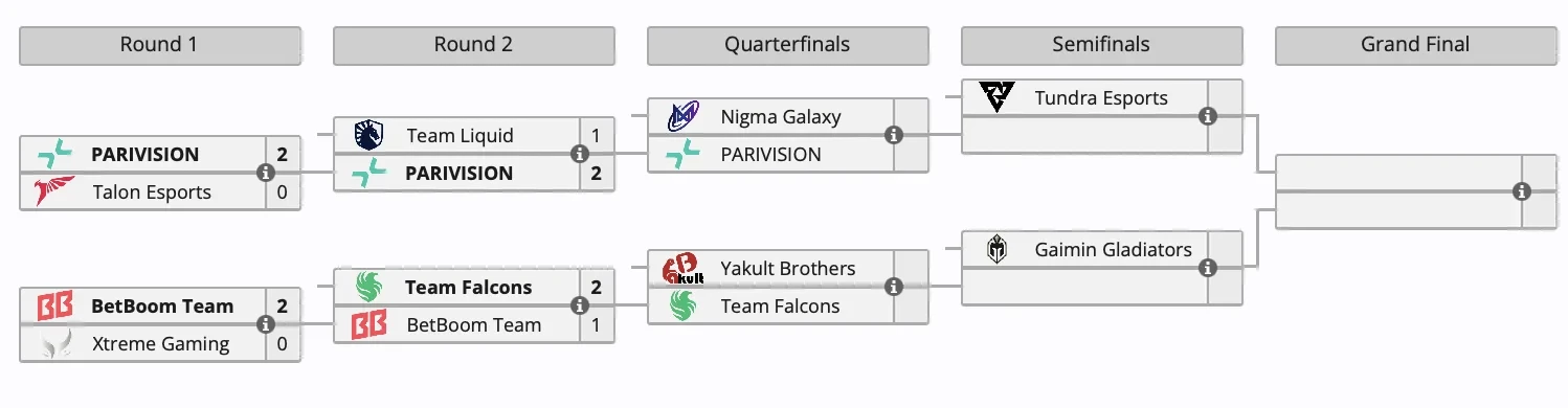 7 февраля PARIVISION теперь сыграет с Nigma Galaxy, а Team Falcons встретится с Yakult Brothers.