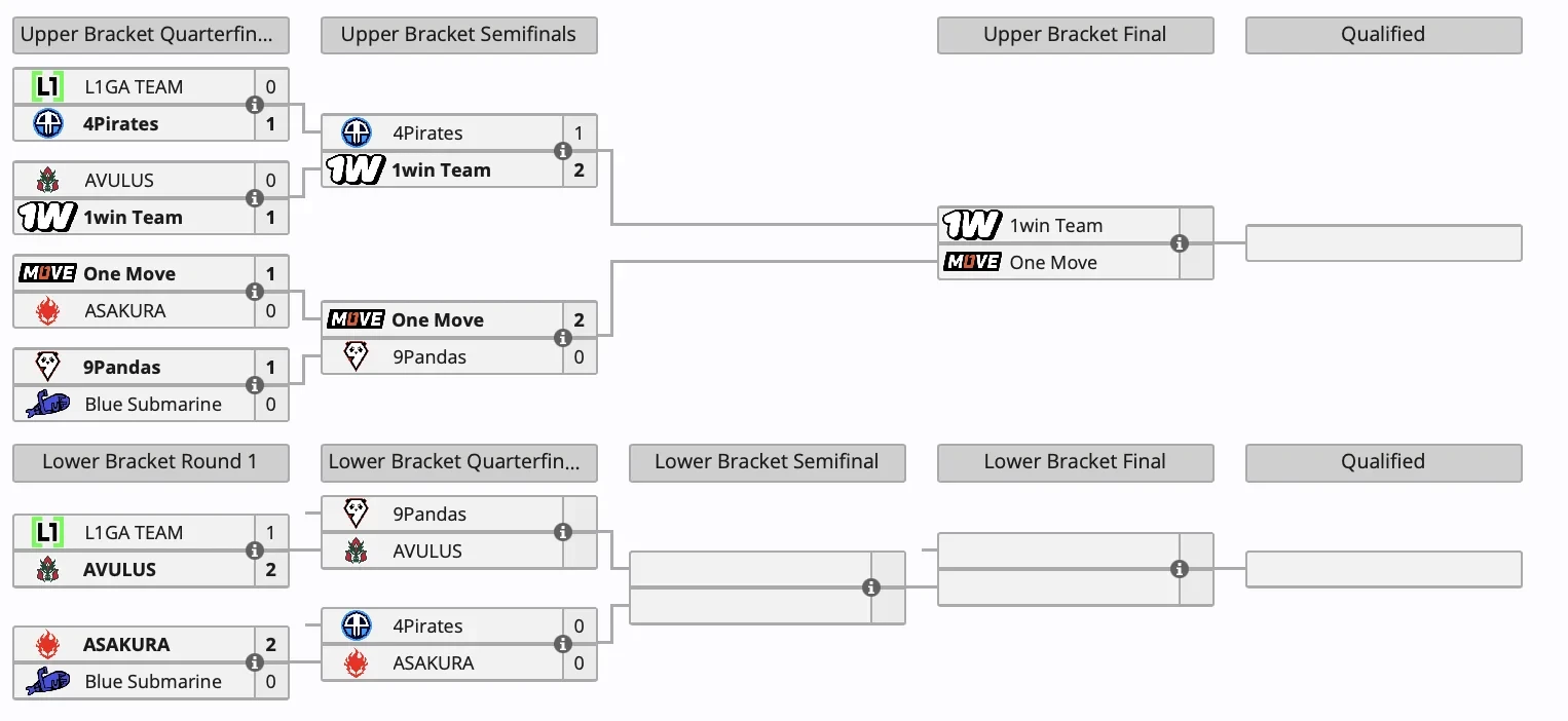 L1GA TEAM и Blue Submarine проиграли по два поединка и покинули турнир. А 1win Team и One Move прошли в финал верхней сетки, где разыграют первый слот.