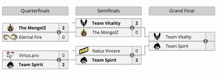 Днем ранее Team Vitality разгромила The MongolZ, а Team Spirit вывела из борьбы Natus Vincere. Оба матча завершились со счетом 2:0. Проигравшие разделили 3-4 место и заработали по 80 тыс долларов.