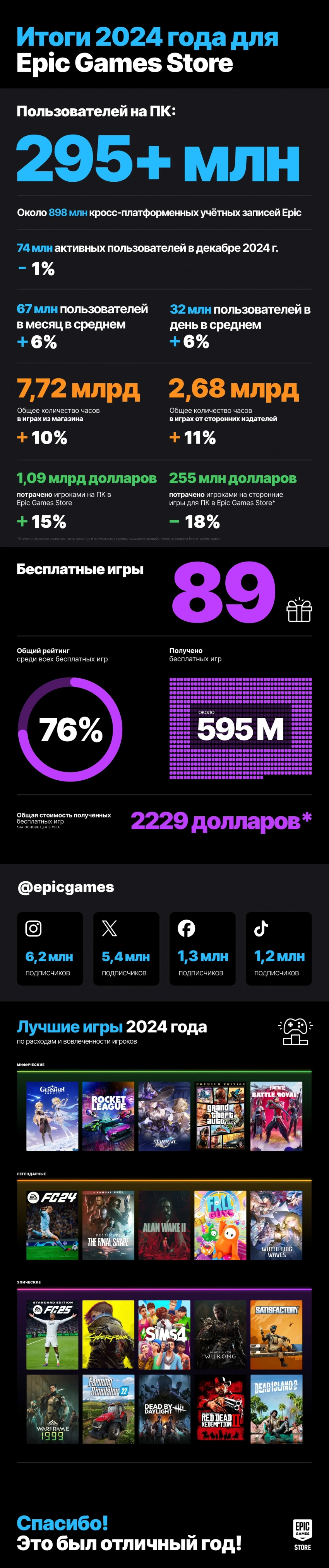В то же время общий объём платежей через EGS увеличился до 1,09 миллиарда долларов (+15%), включая транзакции в играх от самой Epic Games, таких как Fortnite и Rocket League. - Также в течение года пользователи получили 89 бесплатных игр — на 3 больше, чем в 2023 году.