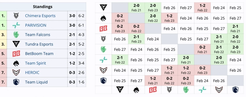Chimera обыграла Team Spirit со счетом 2:1. PARIVISION была сильнее HEROIC — 2:0. Falcons победила Liquid — 2:0., а Tundra выиграла сражение с BetBoom — 2:0.