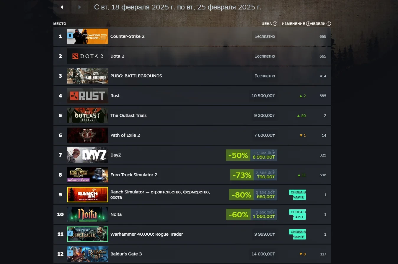 В начале февраля вышла Kingdom Come: Deliverance 2. Средневековая RPG получилась отличной, о чём можно узнать из обзора Игромании, поэтому неудивительно её расположение на четвёртом месте даже спустя три недели после релиза. Тройку лидеров при этом закрывает портативный PC Steam Deck.