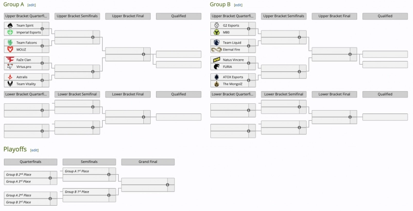Team Spirit, Imperial Esports, Team Falcons, MOUZ, FaZe Clan, Virtus.pro, Astralis и Team Vitality попали в группу А.