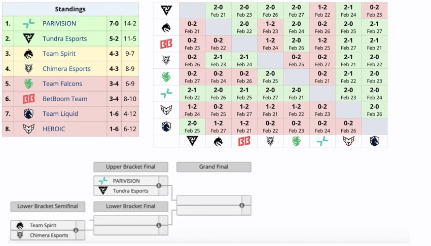 В верхнюю сетку прошли PARIVISION и Tundra Esports. К слову, PARIVISION во втором этапе групповой стадии не проиграла ни одного матча. В нижнюю сетку попали Team Spirit и Chimera Esports. Все команды сыграют 1 марта.