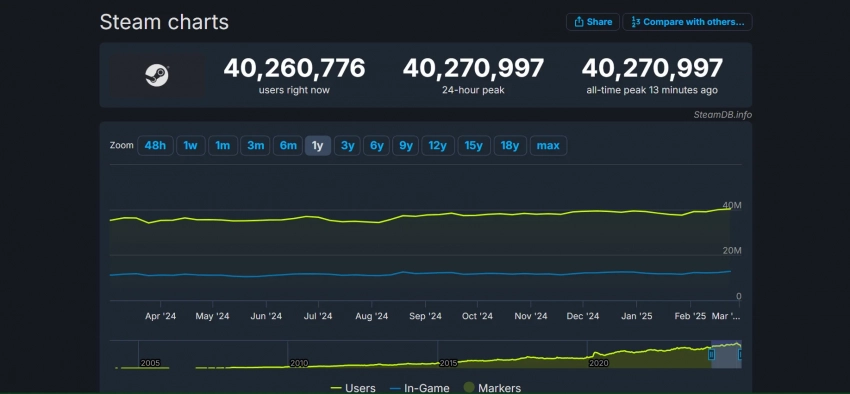 Пиковый онлайн Steam впервые в истории превысил 40 миллионов человек