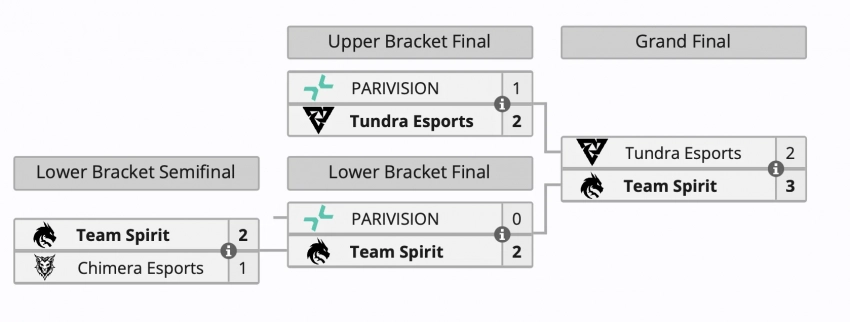 Team Spirit заработала 290 тысяч долларов за свою победу, в то время как Tundra Esports, занявшая второе место, получила 130 тысяч долларов. Также команды получили рейтинговые очки: 4,620 и 3,920 соответственно.