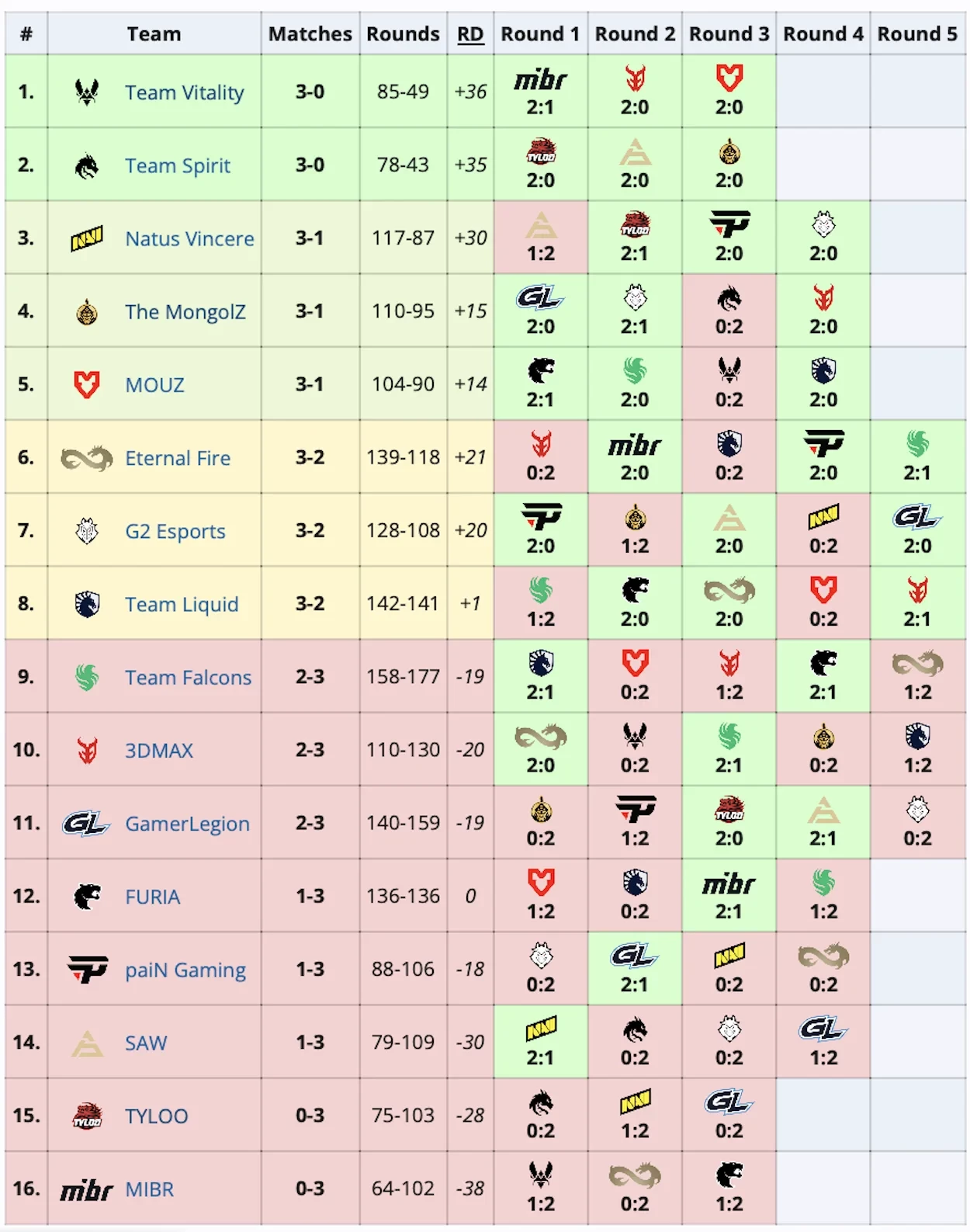 Таким образом, в плей-офф сыграют Team Vitality, Team Spirit, Natus Vincere, The MongolZ, MOUZ, Eternal Fire, G2 Esports и Team Liquid.
