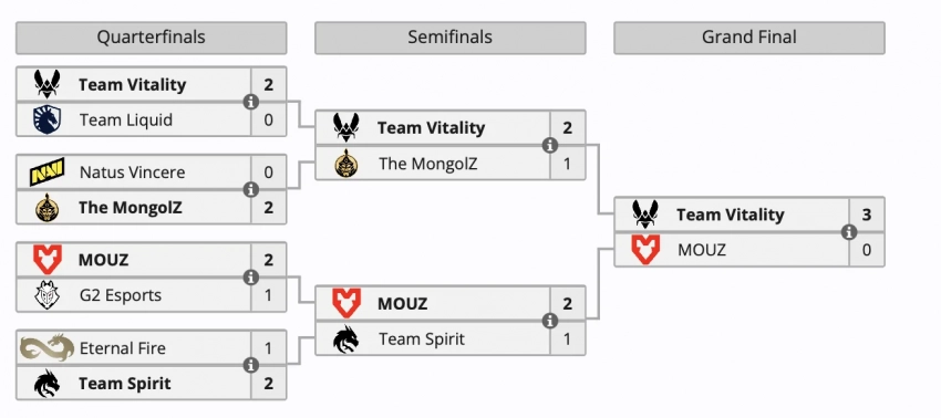 Матье «ZywOo» Эрбо стал MVP турнира. Team Vitality получила 100 тыс долларов. Второе место принесло MOUZ 50 тыс долларов.