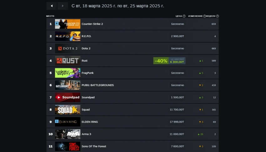 Что касается российского региона, то и тут лидером стал шутер Counter-Strike 2. А вот R.E.P.O. неожиданно показала себя даже лучше, чем Dota 2 и Rust. Также российские пользователи уделяют внимание новенькой FragPunk, а Elden Ring вернулась в первую десятку и заняла девятое место. Вероятно, на возвращение повлияла скидка.