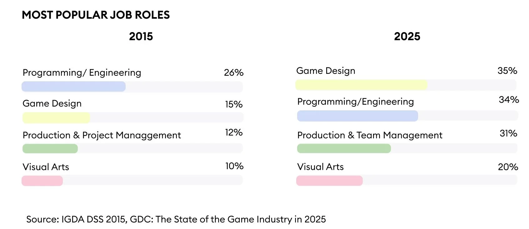 • Меняется не только средний возраст. В 2015 году женщины составляли лишь 19% от общего числа разработчиков игр, но в 2025 году этот показатель подскочил на 6%.