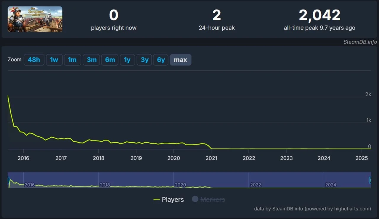 The Settlers Online — упрощённая браузерная стратегия по вселенной The Settlers, компания Ubisoft и студия Blue Byte выпустили её в 2010 году. Пятью годами позже игра вышла в Steam, где собирает отрицательные отзывы — всего 37% игроков готовы признать достоинства условно-бесплатной стратегии. Да и с игроками, по данным SteamDB, у неё негусто, уже несколько лет онлайн не поднимается выше десятка человек.