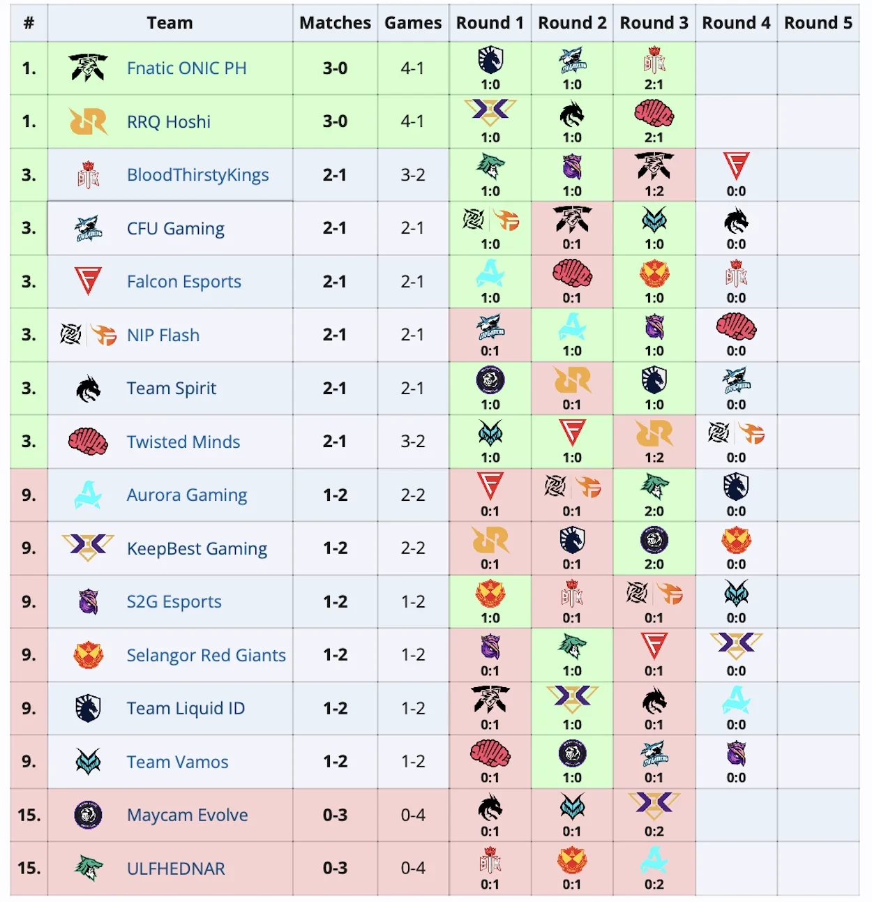 Отметим, что первыми в плей-офф вышли Fnatic ONIC PH и RRQ Hoshi. А вот турнир покинули Maycam Evolve иULFHEDNAR — оба коллектива потеряли шансы на выход в нокаут-стадию.