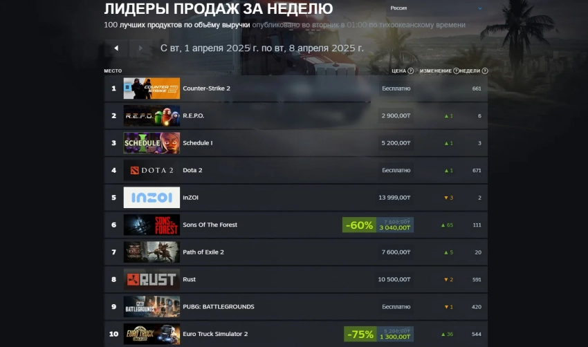 Например, вслед за шутером идёт криминальный симулятор Schedule I, который вышел в конце марта и попал в скандал — разработчиков винят в краже различных элементов и механик, из-за чего потенциально их ждёт суд. Недавней новинке удалось опередить кооперативный хоррор R.E.P.O., а также портативный компьютер Steam Deck.