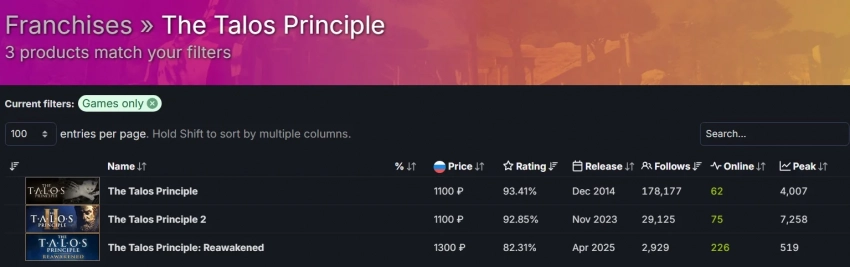 Местный пиковый онлайн The Talos Principle: Reawakened вышел скромным — 519 игроков одновременно. Оригинал в своё время привлёк более 4 тыс игроков одновременно.