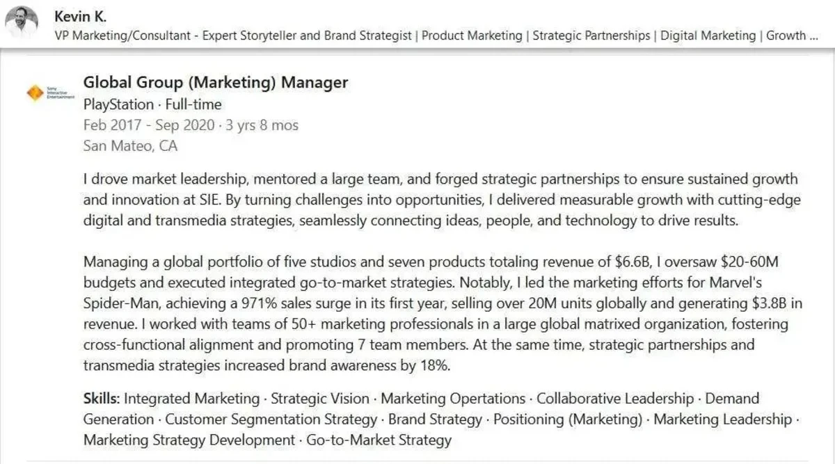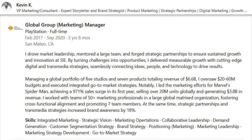 В компании автор работал три года, в период с февраля 2017-го по сентябрь 2020-го. Заодно Кевин в профиле упомянул, что распоряжался бюджетами на уровне 20-60 млн долларов и занимался портфолио пяти студий, общая выручка от семи игр которых достигла 6,6 млрд долларов. Деталей по этому поводу, правда, не уточнили.
