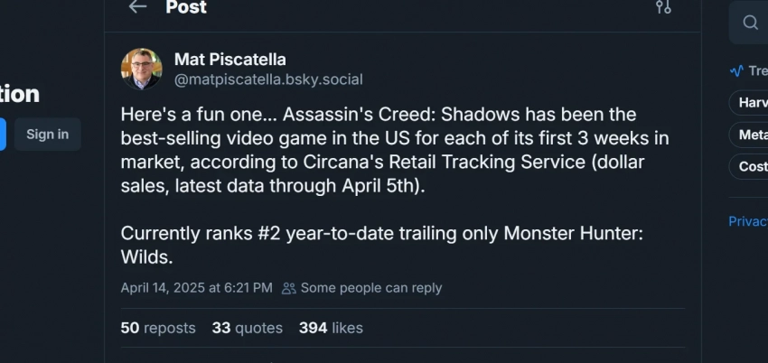 Assassinʼs Creed Shadows захватила чарты США, но уступила одной игре