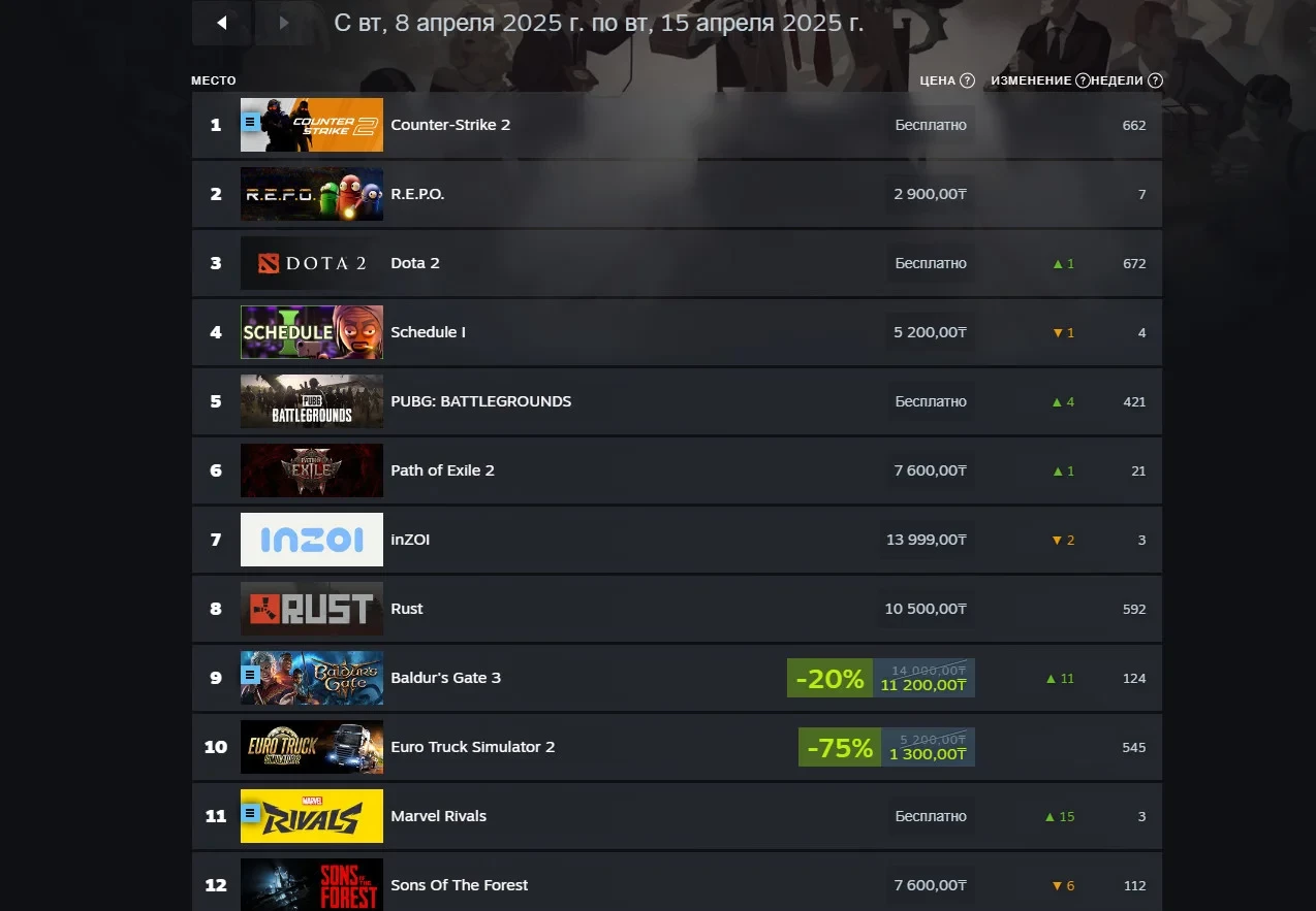 Ещё больше интересных видео на YouTube канале Игромании!Обложка: скриншот Marvel RivalsValve поделилась чартом продаж Steam за неделю с 8 по 15 апреля. Лидером по выручке среди всех игр стала условно-бесплатная Counter-Strike 2, а следом идёт криминальный симулятор Schedule I. Напомним, что последний стал неожиданным хитом и даже заимел подделки-подражатели на консолях.