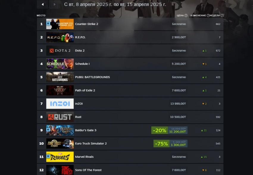 Поговорим и про отечественный сегмент Steam. В России первые три места достались Counter-Strike 2, R.E.P.O. и Dota 2. Криминальные похождения в Schedule I также привлекли геймеров — игра заняла четвёртую строчку. А вот Baldur’s Gate III, как и в мировом чарте, расположилась на девятом месте.