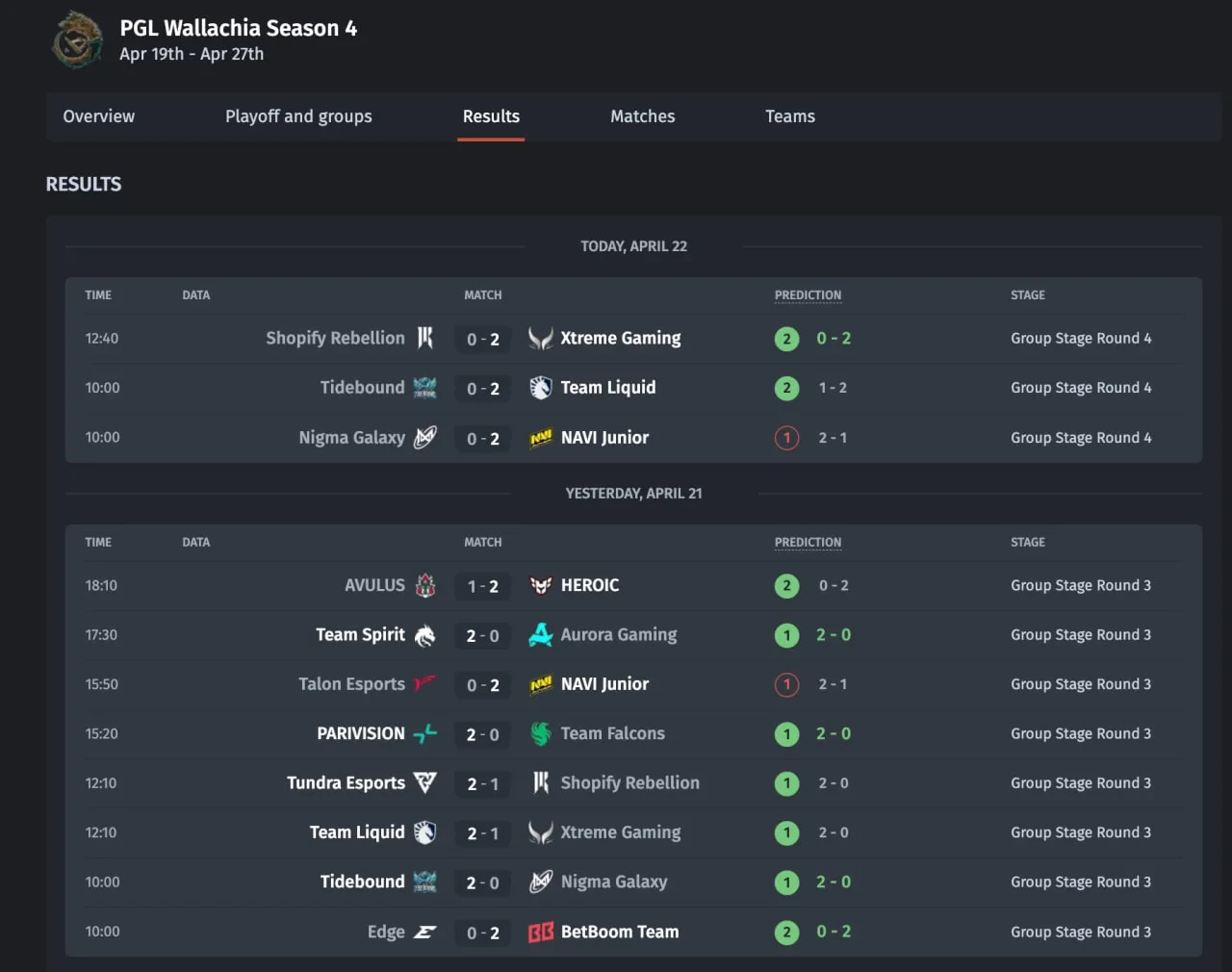 Результаты прошедших матчей 21–22 апреля