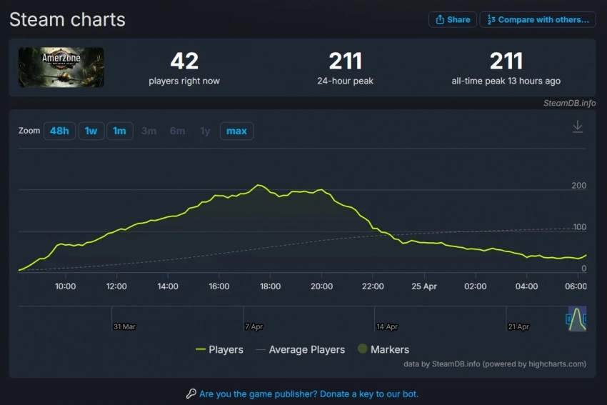 К сожалению, Amerzone: The Explorerʼs Legacy не особо заинтересовал геймеров на ПК. На момент написания новости в ней, согласно SteamDB, находятся 42 игрока, а пиковый онлайн составил 211 человек одновременно.