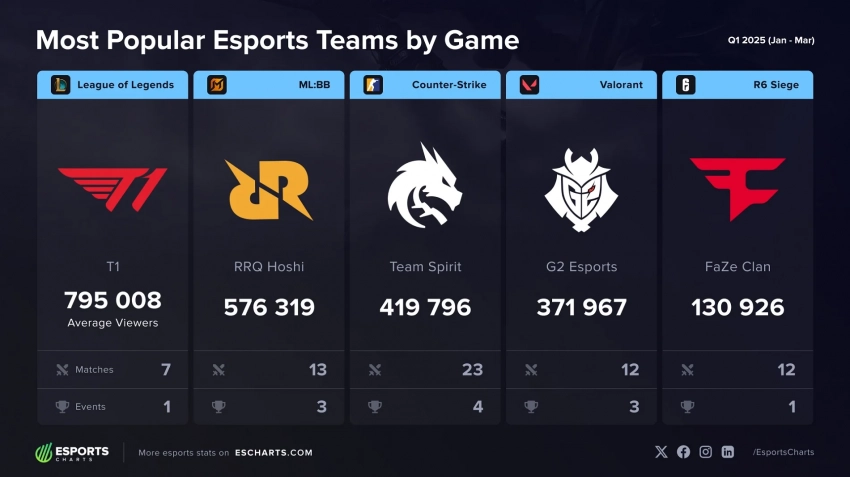 Названы самые популярные команды по League of Legends, CS2 и другим играм в 2025 году