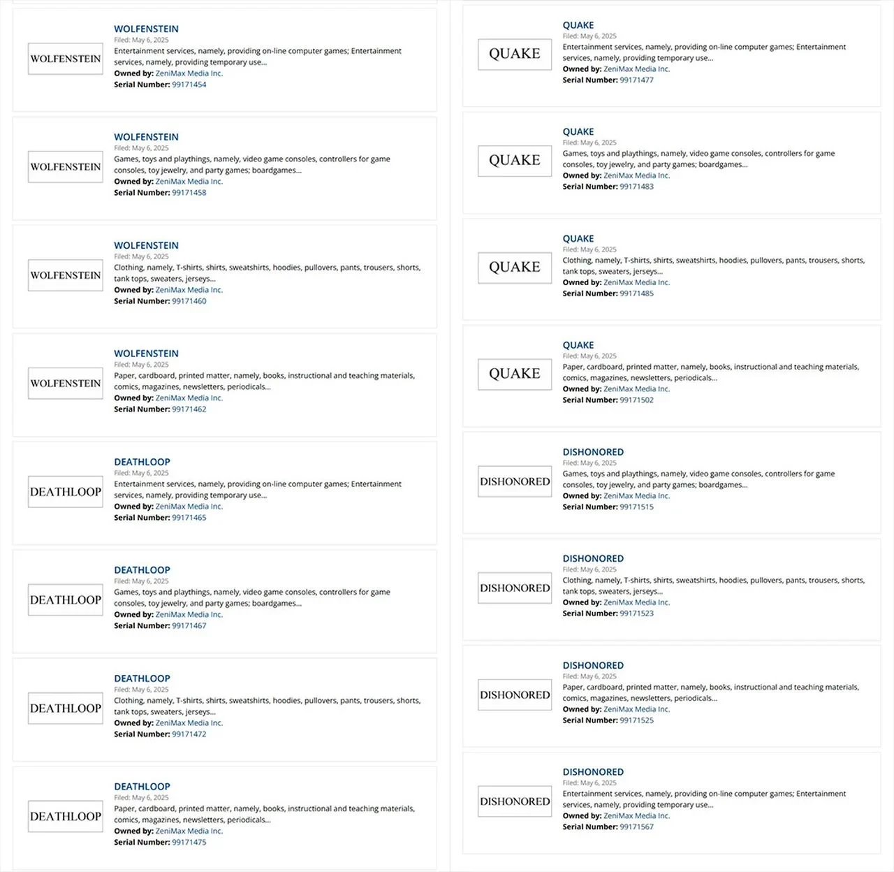 Насколько можно судить, свидетельств планов на развитии игровых серий в новых заявках не содержится. Судя по всему, ZeniMax решила обезопасить популярные названия от появления коллекций пижам и нижнего белья под маркой Dishonored или Deathloop.