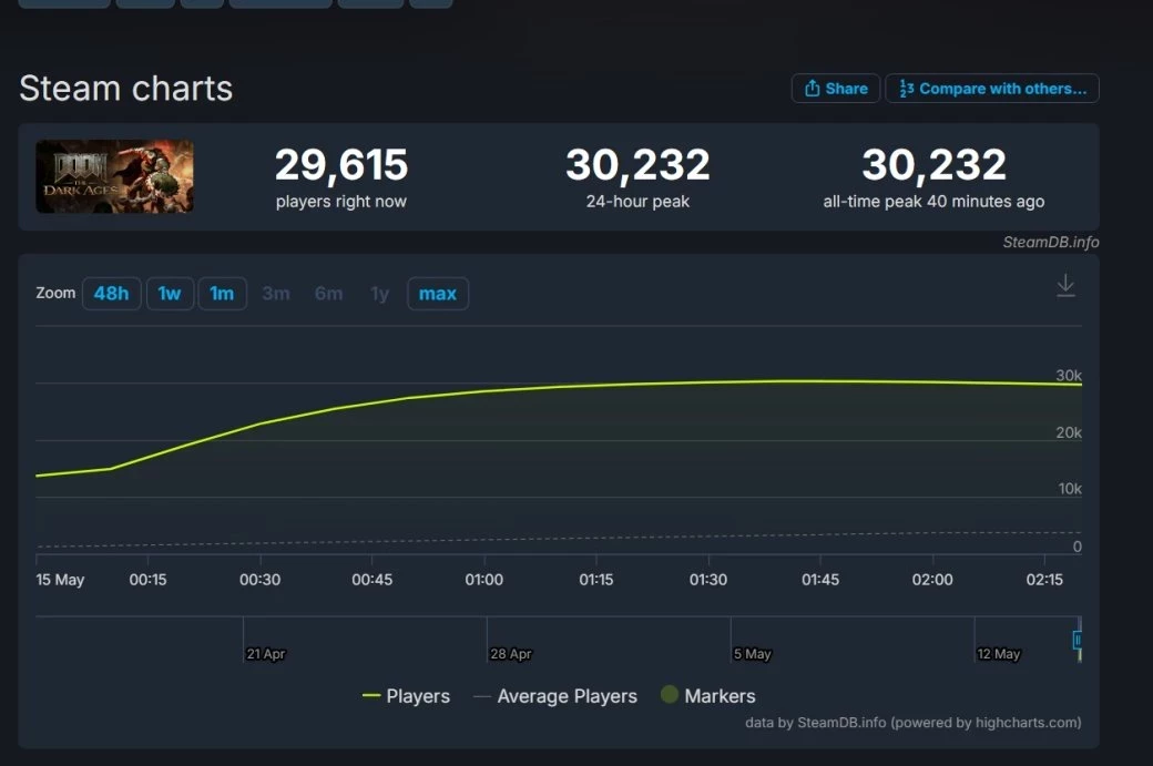 На момент написания новости пиковый онлайн DOOM: The Dark Ages в Steam составил 30 232 игрока одновременно. Это третий лучший результат в рамках серии:
