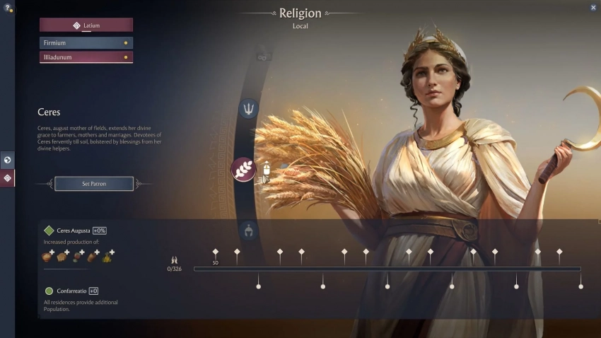 В начале игры у нас будет всего четыре божества — Церера, Нептун, Минерва и Марс. Со временем, развивая Религию, мы сможем разблокировать новых патронов.