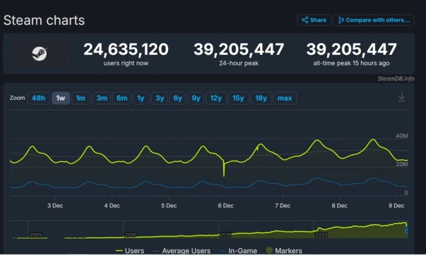 Это новый рекорд платформы. Предыдущий был зафиксирован в сентябре этого года — тогда онлайн Steam составил 38 367 277 человек.