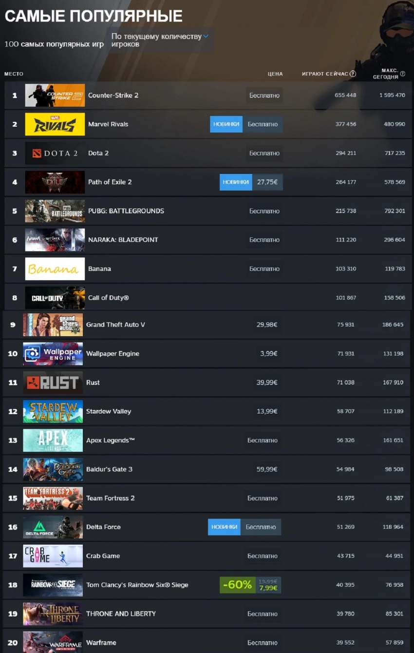 - бесплатный PvP-шутер Marvel Rivals — пиковый онлайн достиг 480 990 игроков одновременно;