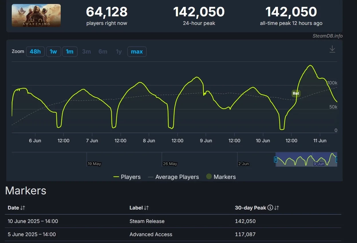 Напомним, что на запуске раннего/расширенного доступа пик онлайна Dune: Awakening поначалу составлял чуть больше 90 тыс. Затем он поднялся до отметки 117 087 игроков одновременно.