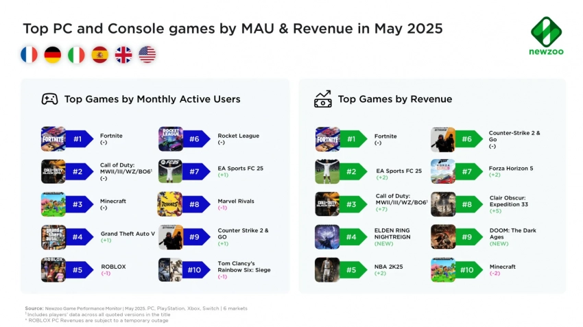 В чарте с наибольшим числом активных пользователей за май нет серьёзных изменений — в топе удерживаются Fortnite, Call of Duty, Minecraft, GTA 5 и другие популярные игры. Большинство из них распространяются по условно-бесплатной модели.