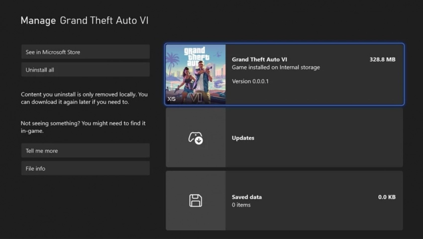 Для этого нужно связать мобильное приложение Xbox со своей консолью и зайти на страницу GTA 6 для удалённой установки игры. Тогда на Xbox Series начнётся загрузка файла размером в 328,76 МБ. При попытке запустить игру появится ошибка. Сам установочный файл наверняка является «заглушкой» для возможной предзагрузки незадолго до релиза GTA 6.