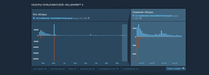 Рисунок на накидке показывает несколько красных линий, напоминающих график обзоров Helldivers 2 в Steam в апреле-мае 2024 года. Наибольшее число отрицательных оценок было выставлено с 2 по 9 мая 2024 года — свыше 220 тысяч негативных обзоров. Однако сейчас ситуация кардинально поменялась — у шутера в основном положительные пользовательские отзывы.